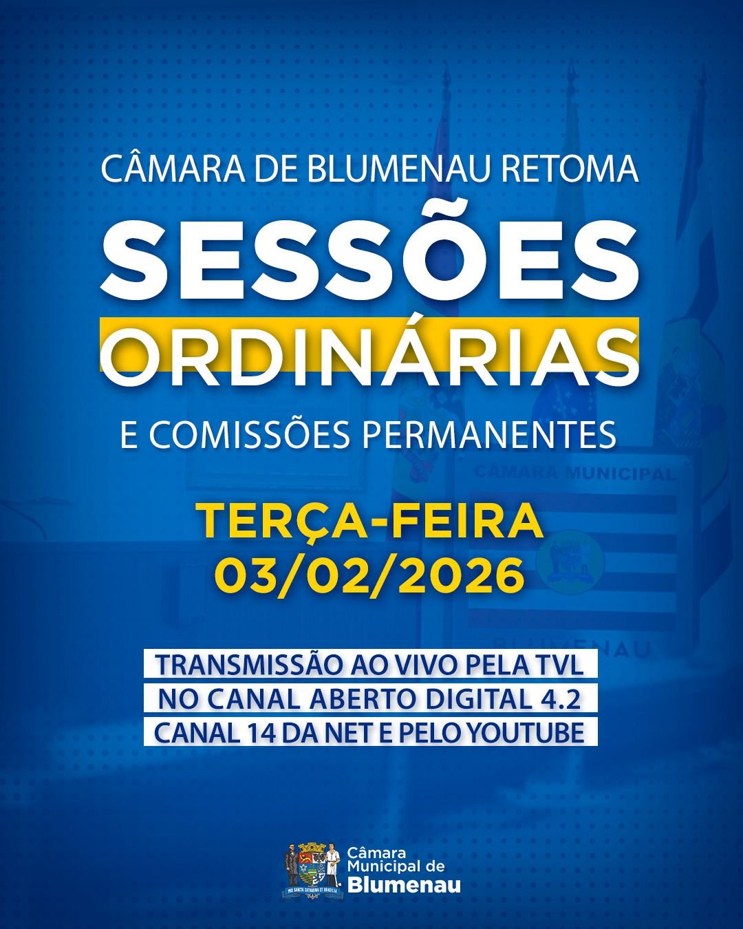 As sessões ordinárias e as reuniões das comissões são transmitidas ao vivo pela TV Legislativa, no canal aberto digital 4.2, canal 14 da NET/Claro, e pelo YouTube, em youtube.com/TvlBlumenau com interpretação em Libras, garantindo acessibilidade às pessoas com deficiência auditiva.