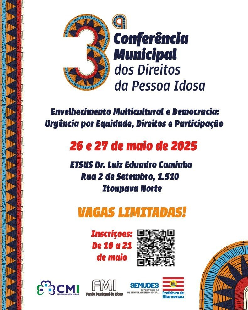 Estão abertas as inscrições para a 3ª Conferência Municipal dos Direitos da Pessoa Idosa, que ocorrerá nos dias 26 e 27 de maio na Escola Técnica de Saúde (Etsus) Dr. Luiz Eduardo Caminha, localizada na Rua 2 de Setembro, 1.510, bairro Itoupava Norte. A Conferência é organizada pela Secretaria Municipal de Desenvolvimento Social (Semudes) e o Conselho Municipal do Idoso (CMI).