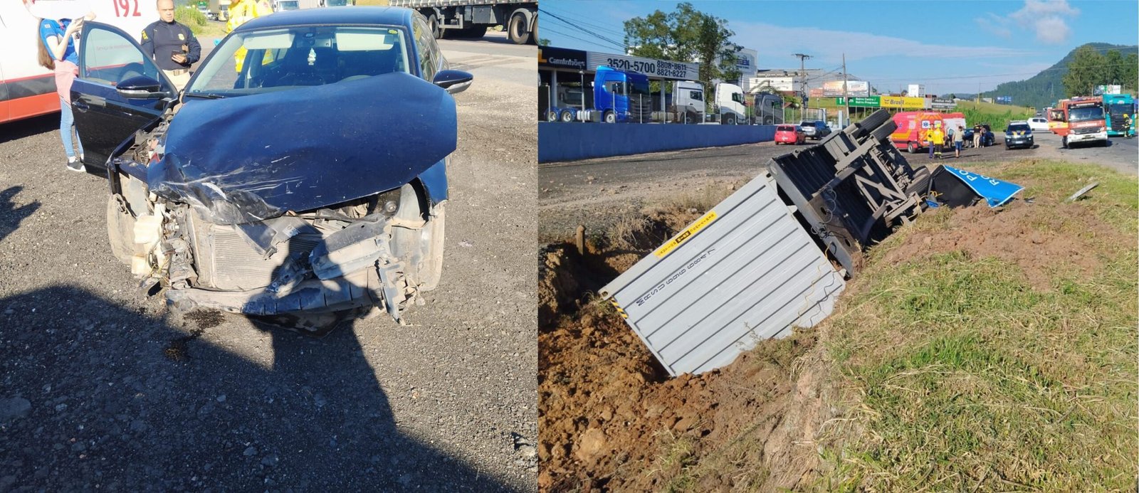 Da colisão resultou no desprendimento do último compartimento de carga da carreta, seguido de tombamento em uma vala às margens da via.