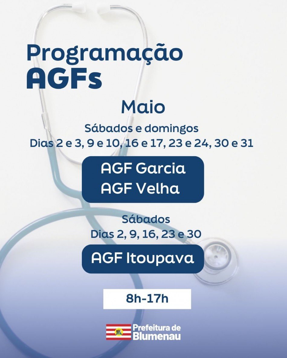 Os moradores de Blumenau que precisarem de atendimento ambulatorial ou vacinação durante os fins de semana de maio podem contar com os Ambulatórios Gerais da Família (AGFs) Garcia, Velha e Itoupava. As unidades funcionarão das 8h às 17h, garantindo assistência à comunidade. Os AGFs Garcia e Velha ficam abertos aos sábados e domingos. Já no AGF Itoupava, o atendimento ocorre somente aos sábados.