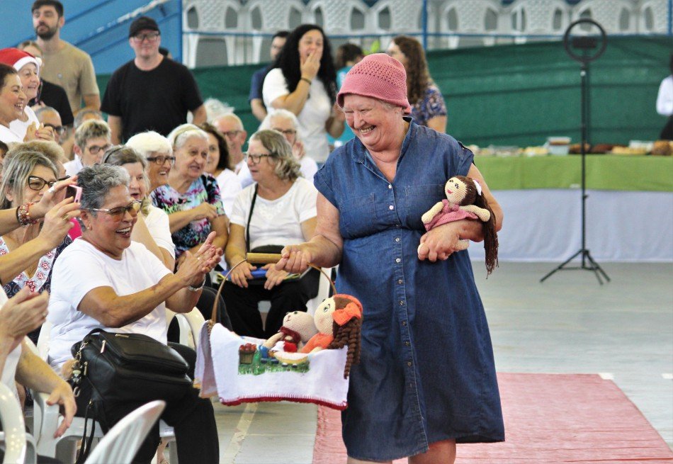 Entre as modelos da tarde, estava a simpática Lia Carmen Brehmer. Aos 74 anos, ela produz bonecas de crochê e encontrou na arte uma forma de expressar habilidade, criatividade e muita história. “Eu amo participar das aulas. Faço crochê, pintura em pano. Amo fazer arte aqui na Pró-família e é muito bom terminar o ano assim, com estilo”, celebrou.