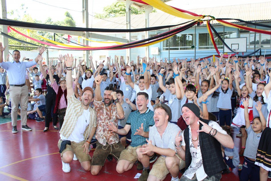 Uma das principais atrações da 39ª Oktoberfest Blumenau, a banda alemã VoxxClub visitou a EBM Bilíngue Duque de Caxias na manhã desta sexta-feira, dia 25. A instituição, localizada no bairro Itoupava Central, é uma das cinco escolas bilíngues em alemão da rede pública municipal de Blumenau.
