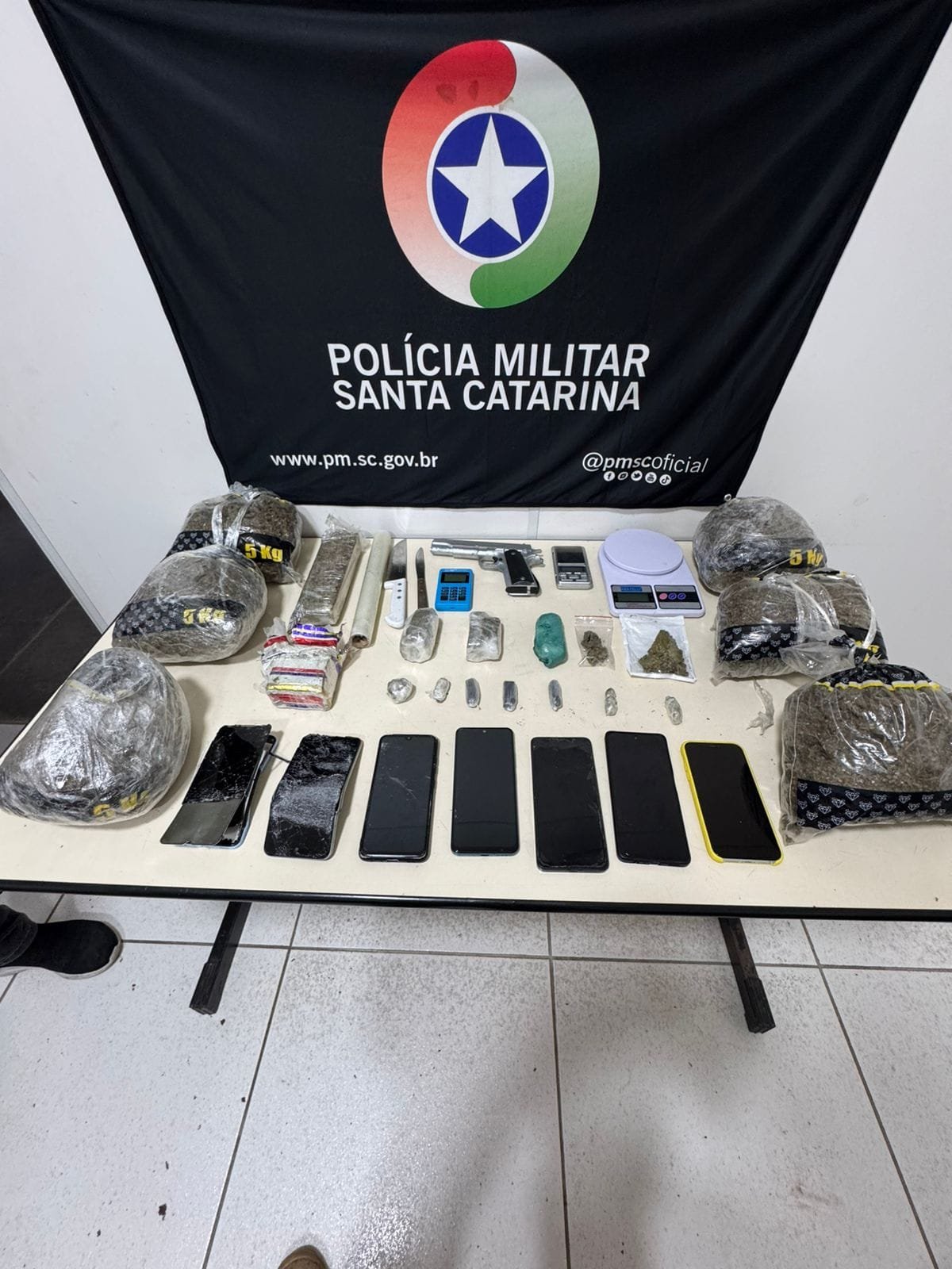 justiça, pois saíram de forma temporária do sistema carcerário e não retornaram na data prevista. Importante frisar também que no local havia um usuário de drogas para efetuar a compra da droga. Foram apreendidos vários objetos utilizados para pesar, fracionar e embalar a droga para a venda, e a quantidade de, aproximadamente, 4kg de maconha, na casa e em locais escondidos na mata. Além disso foi apresentado na delegacia um simulacro de arma de fogo, bem como uma maquina de cartão, que estaria sendo utilizada para que os usuários efetuassem o pagamento pelas drogas compradas de forma ilegal, e os aparelhos celulares, apreendidos na casa. Consoante a cena criminal em tela, a Polícia Militar conduziu os traficantes e os apresentaram na Delegacia de Polícia Civil para medidas legais cabíveis, sendo que agora ficarão á disposição da justiça para a devida responsabilização penal pelos crimes acima narrados, juntamente com os materiais ilícitos.