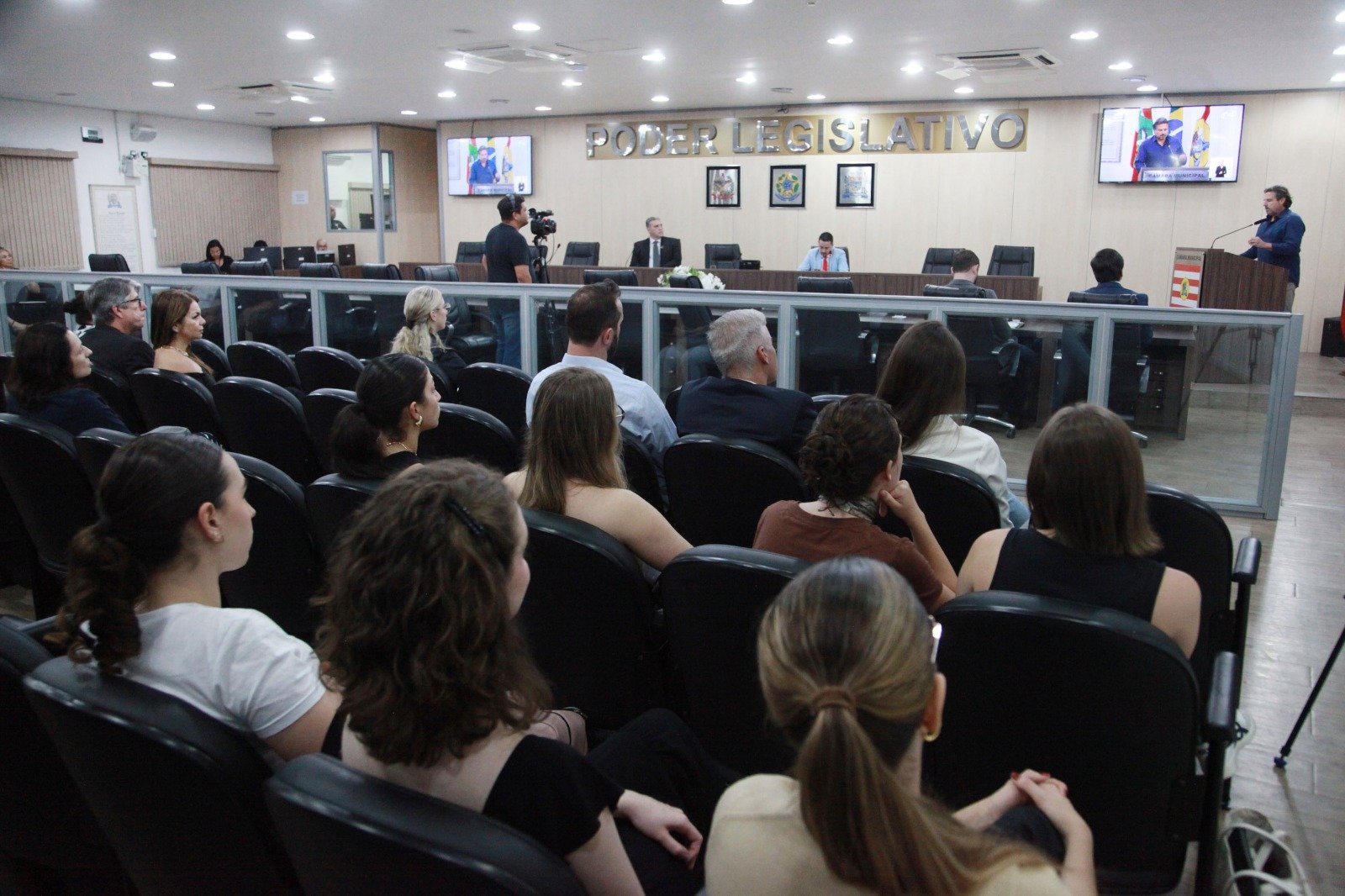 O vereador Marcelo Lanzarin (Progressistas) fez a entrega da homenagem ao curso de medicina da Universidade Regional de Blumenau (Furb) pela celebração dos seus 35 anos de história e de uma moção de louvor a Leandro José Hass, em reconhecimento à trajetória e contribuições como neurocirurgião e coordenador do curso de medicina da Furb.