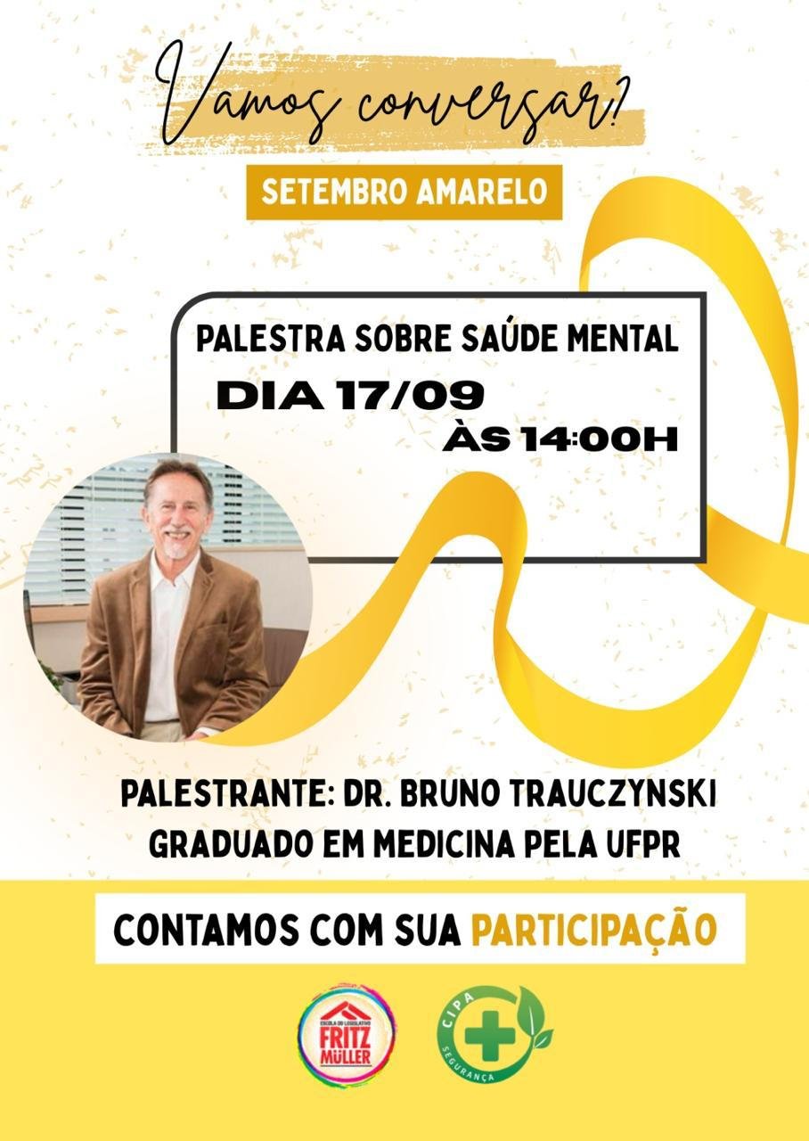 A Câmara Municipal de Blumenau, por meio da Escola do Legislativo Fritz Müller e da Comissão Interna de Prevenção de Acidentes e Assédio (CIPAA), promove na próxima quarta-feira, 17 de setembro , uma palestra sobre saúde mental, em alusão ao Setembro Amarelo, mês dedicado à valorização da vida e à prevenção do suicídio.