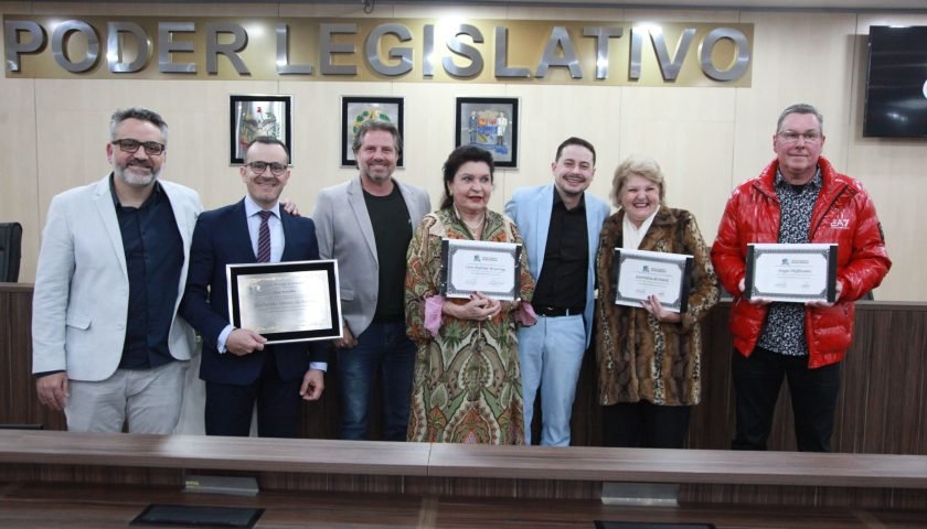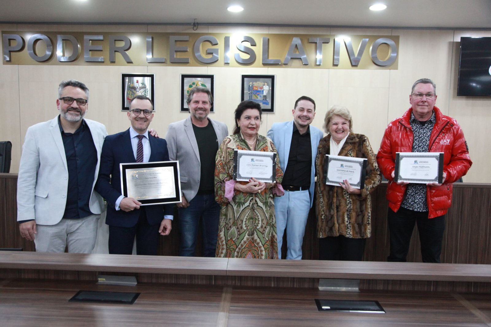 A Câmara de Blumenau realizou, na noite desta terça-feira (1º), uma sessão solene para entrega de moções de louvor e de título de Cidadão Blumenauense, no Plenário da Casa. O Poder Legislativo fez a entrega de quatro homenagens às personalidades que se destacam pelo trabalho realizado em favor do município. Estiveram presentes os vereadores Jean Volpato (PT), que presidiu a solenidade; Professor Gilson de Souza (União Brasil) e Marcelo Lanzarin (PP). Além dos homenageados, seus familiares, amigos e demais convidados.