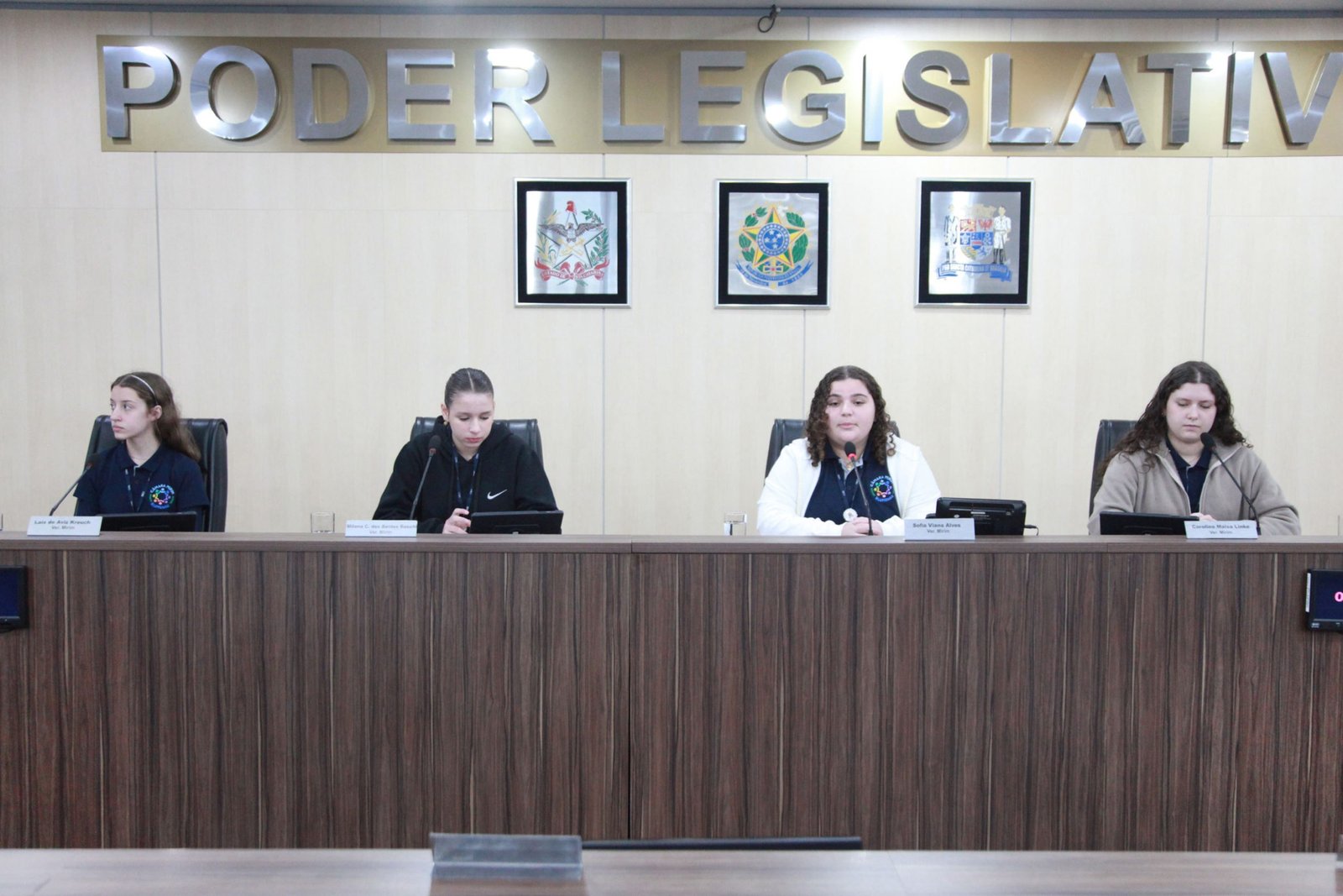 Nas fotos, a presidente mirim Sofia Viana Alves e também as demais integrantes da Mesa Diretora Mirim: Vice-presidente Caroline Maisa Linke; 1ª secretária Milena Cristine dos Santos Becchi e 2ª secretária Laís de Aviz Kreuch.