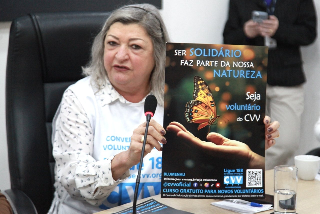 Na segunda reunião de trabalho da Comissão Legislativa Temporária Especial para Discussão sobre Política Pública de Saúde Mental da Câmara de Blumenau, na manhã desta quinta-feira (17), o tema central do debate foram as políticas preventivas de defesa da vida. Por isso, na lista de convidados havia profissionais que atuam no Centro de Valorização da Vida (CVV), que funciona como um pronto-socorro emocional.