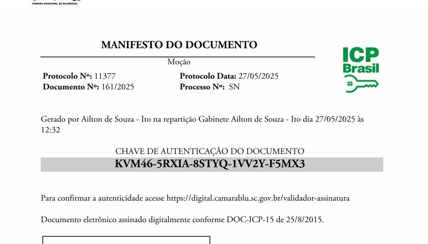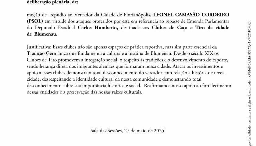 O vereador de Florianópolis, Leonel Camasão Cordeiro (PSOL), recebeu nesta semana uma moção de repúdio assinada pela Câmara de Blumenau. Uma iniciativa do presidente da Casa, vereador Ailton de Souza – Ito (PL) em virtude de declarações feitas contra o repasse de emenda parlamentar de um deputado estadual aos Clubes de Caça e Tiro do Vale do Itajaí.