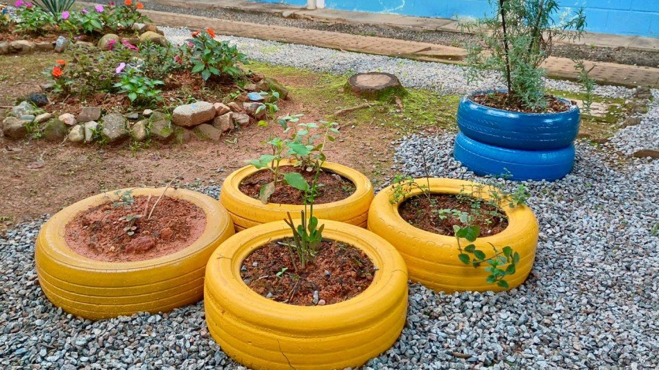 O espaço foi implantado em uma área do pátio da escola que estava sem uso e, a partir disso, surgiu a ideia de transformá-lo em uma horta de chás, utilizando pneus como canteiros elevados, uma solução criativa, acessível e sustentável.