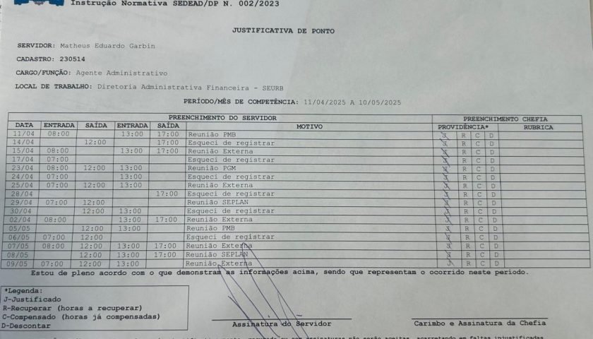 As denúncias apontam que o servidor aparece apenas esporadicamente na SEURB, justifica ausências com alegações genéricas de participação em reuniões na Prefeitura — muitas das quais não teriam ocorrido ou não são comprovadas por atas, listas de presença ou registros formais. Mesmo assim, Garbin seguiria recebendo integralmente seus vencimentos, além da gratificação.