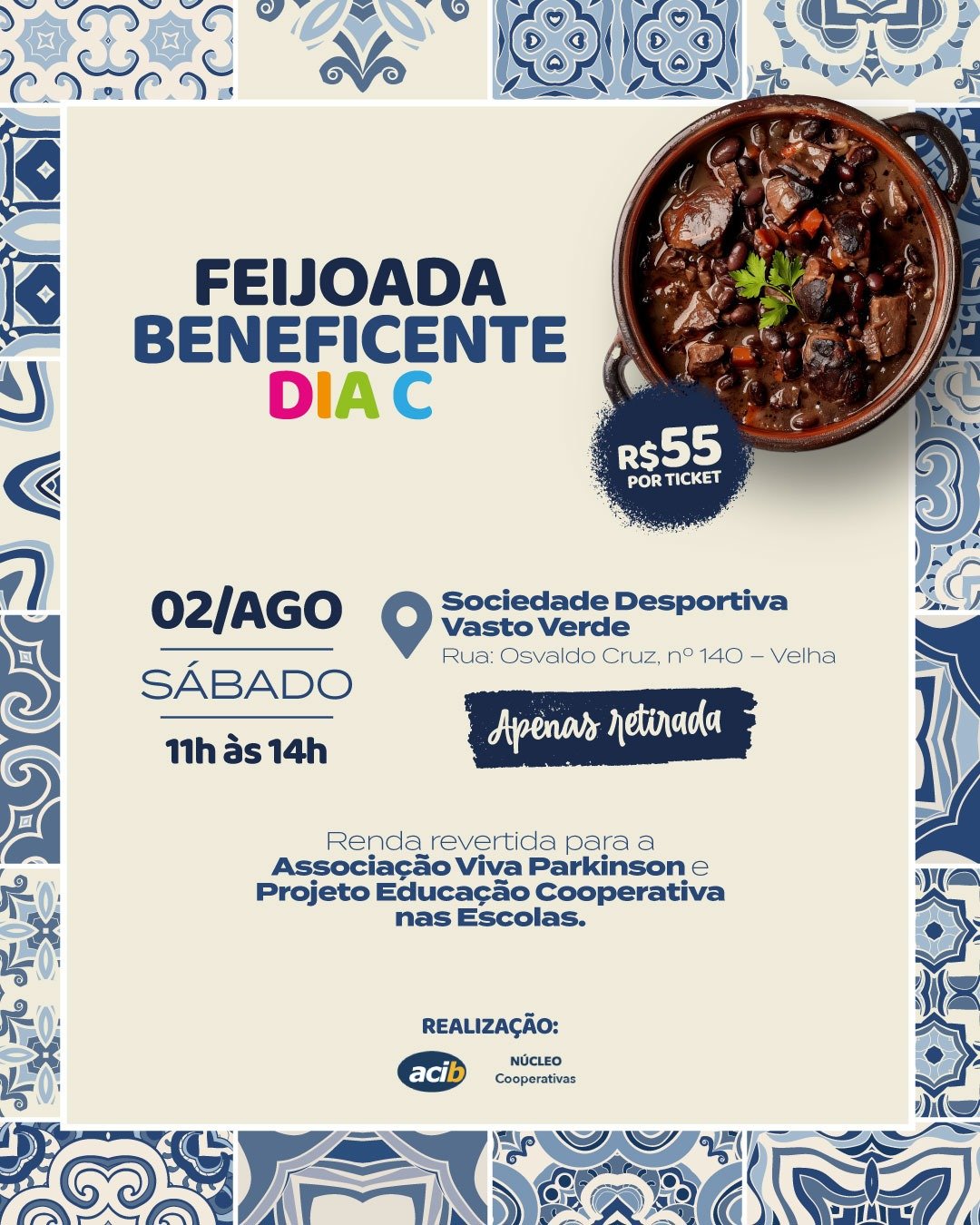 No dia 2 de agosto, o Núcleo de Cooperativas de Acib promove mais uma edição da Feijoada Beneficente. Ela funcionará em formato drive thru, onde as pessoas compram seu ticket antecipadamente e passam para buscar, e será na Sociedade Desportiva Vasto Verde, no bairro Velha.