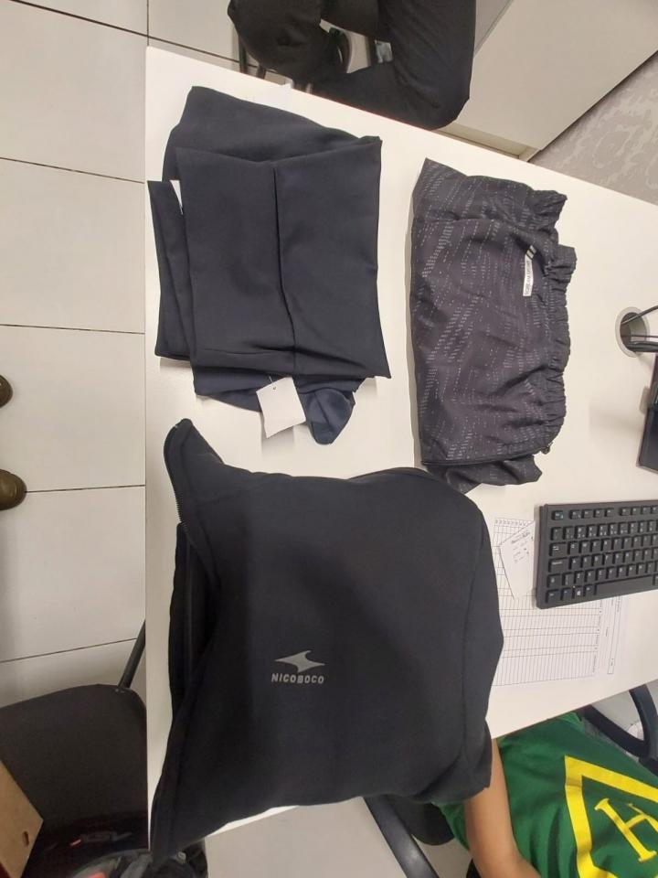 Com o suspeito, foram localizados os seguintes itens furtados: 1 jaqueta – R$ 169,99 1 short – R$ 59,99 1 bermuda – R$ 59,99 1 jaqueta adicional – R$ 99,99 1 par de tênis Nike – R$ 549,99 Valor total dos itens: R$ 939,95.
