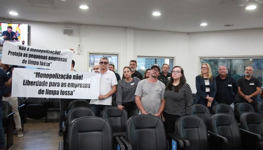 Representantes do ramo de limpa fossa em Blumenau ocuparam o plenário da Câmara de Vereadores, na tarde desta terça-feira (8), em uma manifestação silenciosa contra o monopólio previsto no quinto aditivo do contrato de esgoto, que já está em vigor. O documento determina que apenas a BRK Ambiental possa executar o serviço no município, o que pode provocar um desequilíbrio financeiro e até o fechamento das seis empresas que hoje operam na cidade.