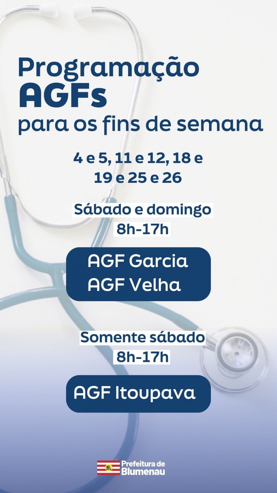 Os Ambulatórios Gerais da Família (AGFs) Garcia, Velha e Itoupava seguem com o atendimento ambulatorial durante os fins de semana de outubro, dias 4 e 5, 11 e 12, 18 e 19 e 25 e 26. Garcia e Velha aos sábados e domingos, e Itoupava, somente aos sábados. O horário de funcionamento será das 8h às 17h.