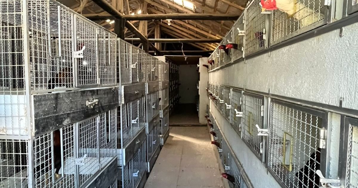 No local, os policiais encontraram uma estrutura organizada para a criação de centenas de galos da raça Mura, conhecidos como “galos combatentes”, comumente utilizados em rinhas — prática considerada crime de maus-tratos a animais.