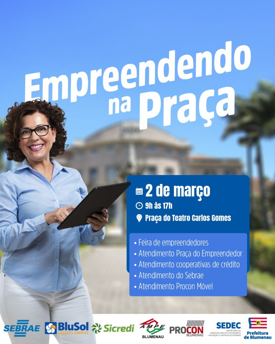A Prefeitura de Blumenau, por meio da Secretaria de Desenvolvimento Econômico, Inovação e Empreendedorismo (Sedec), realiza neste sábado, dia 2, a primeira edição do Empreendendo na Praça. O objetivo é descentralizar os serviços essenciais para quem deseja empreender em Blumenau. O evento será das 9h às 17h, na Praça do Teatro Carlos Gomes.