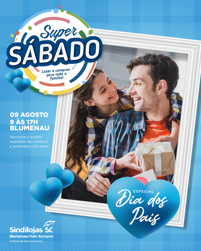 O Sindilojas Blumenau promove neste dia 09 o Super Sábado especial para o Dia dos Pais, com comércio das principais ruas da cidade aberto em horário estendido, das 09h às 17h, com promoções especiais.