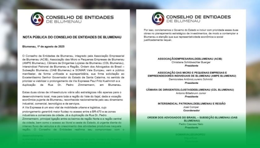 O Conselho de Entidades de Blumenau, formado por representantes da ACIB, AMPE Blumenau, CDL Blumenau, Intersindical…