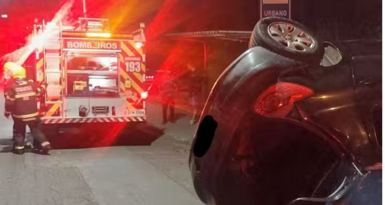 Veículo capota, motorista foge do local e carro começa a pegar fogo em Blumenau. Bombeiros retiraram a bateria e evitaram que as chamas se alastrassem. Caso ficou sob responsabilidade da Guarda Municipal.