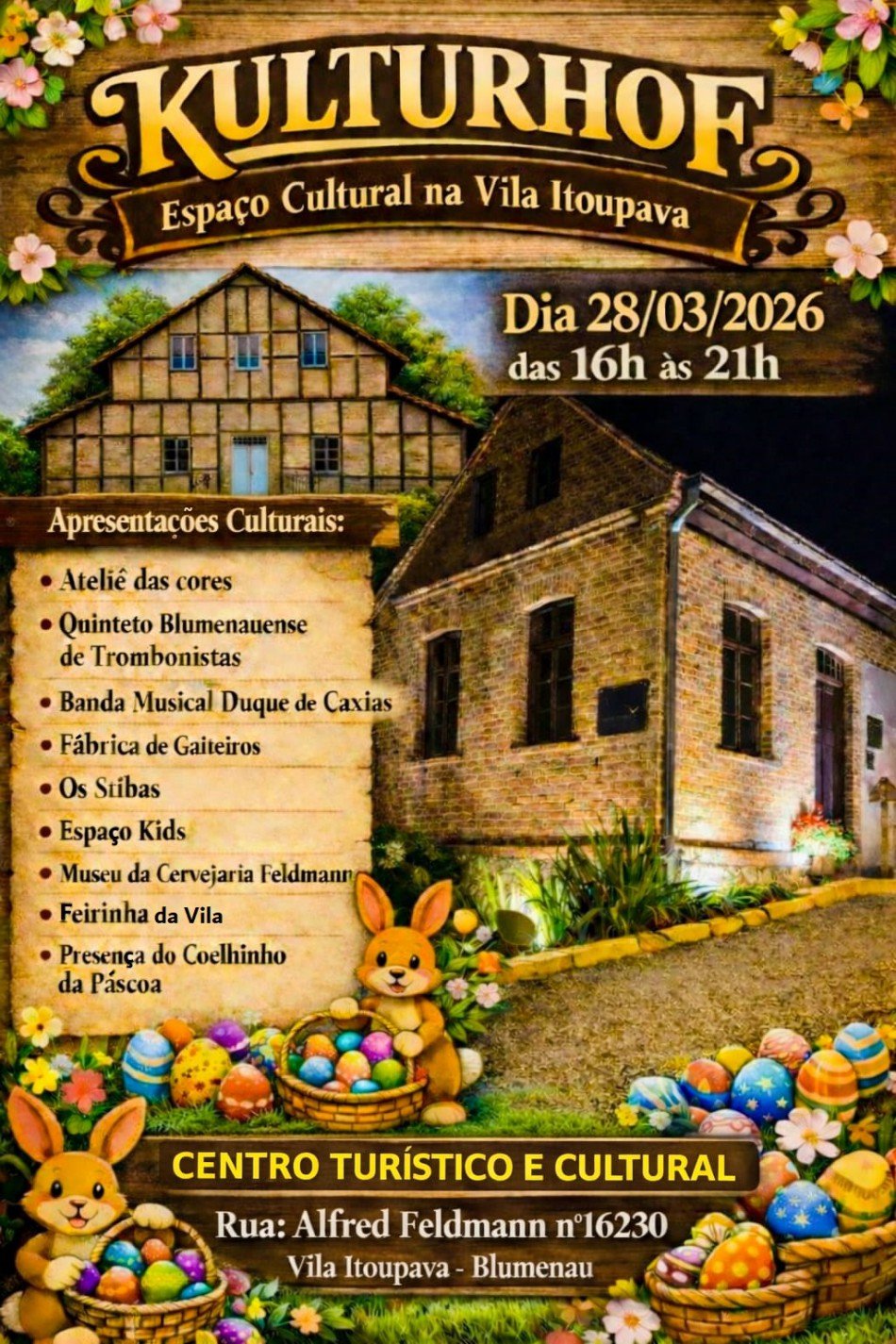 A Intendência Distrital da Vila Itoupava (IDIVI), por meio do Centro Turístico e Cultural Ella Feldmann, promove no sábado, dia 28, o Kulturhof, evento de Páscoa e cultura com diversas atrações destinadas para todas as idades, incluindo a presença do Coelhinho de Páscoa e Feirinha da Vila.