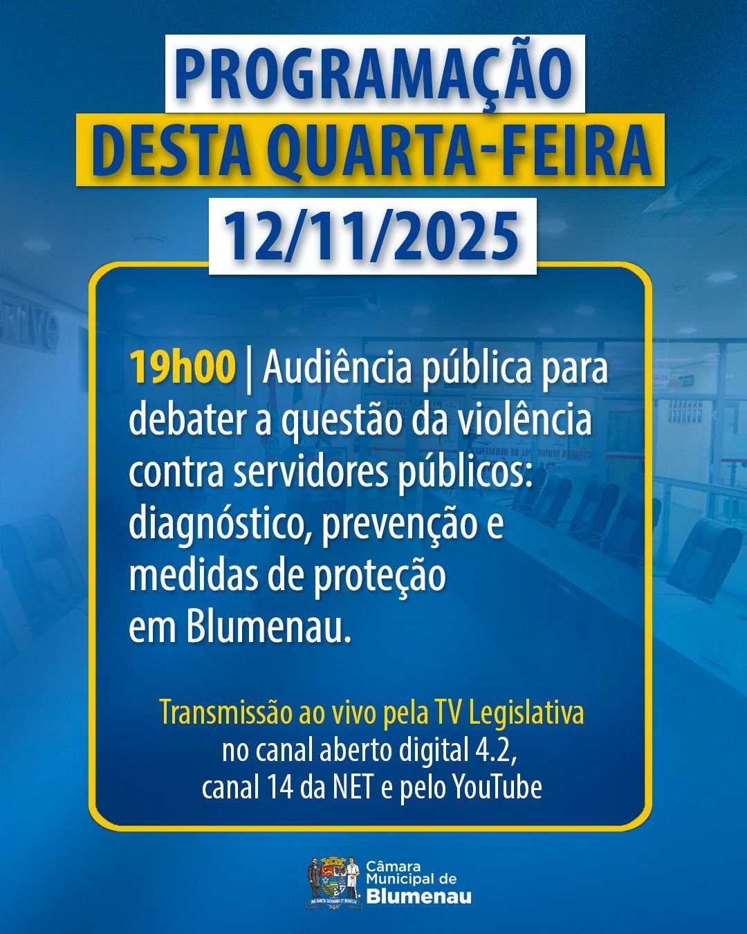 📢 A Câmara de Blumenau realiza, nesta quarta-feira (12), às 19 horas, uma audiência pública para debater o tema “violência contra servidores públicos: diagnóstico, prevenção e medidas de proteção”. A iniciativa foi proposta pelo Requerimento 2063/2025, de autoria do vereador Jean Volpato (PT), aprovado por unanimidade pelos vereadores.